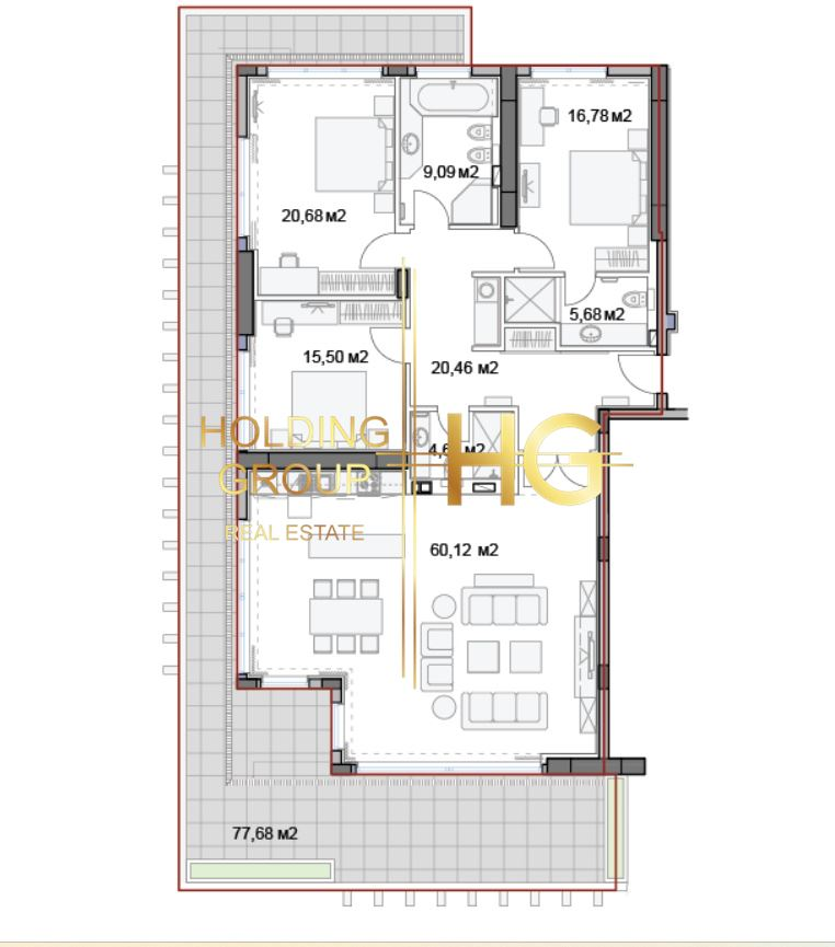 HOLDING GROUP real estate предлага на Вашето внимание стилен четиристаен апартамент с площ – 302 кв.м. (застроена площ 179,82 кв.м.), който се намира на 4-ти жилищен етаж в луксозен затворен комплекс на самият морски бряг.