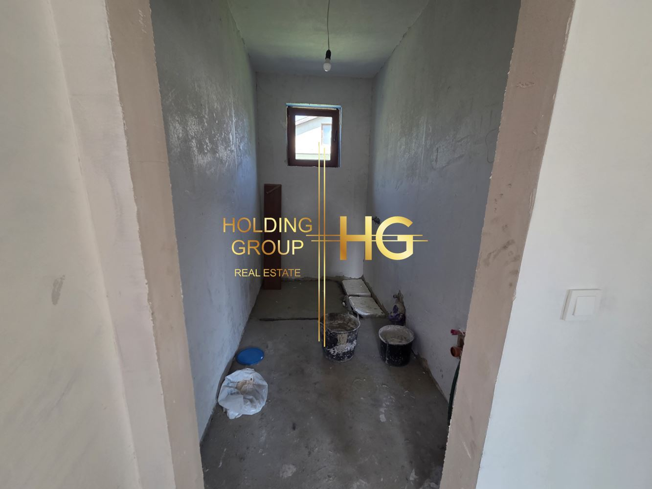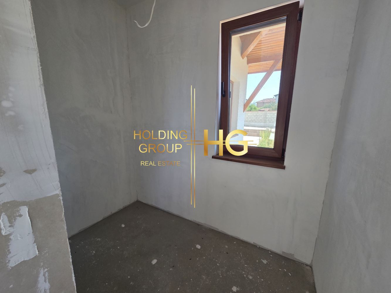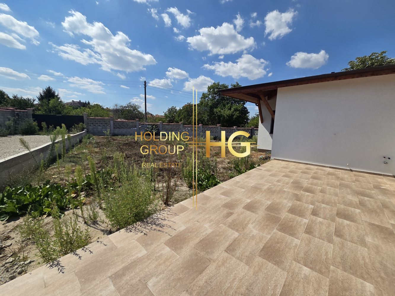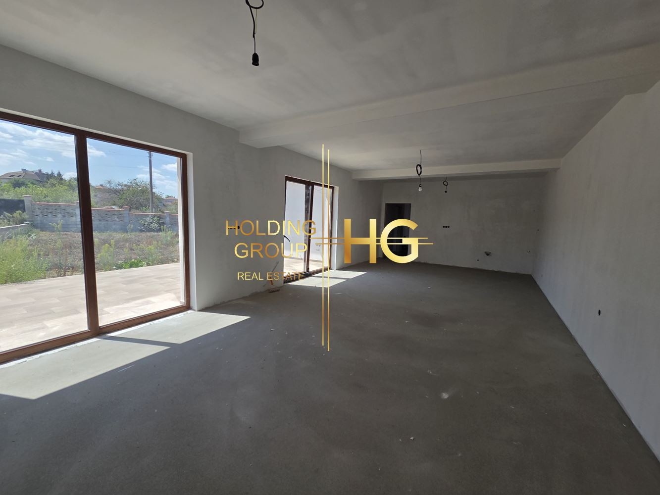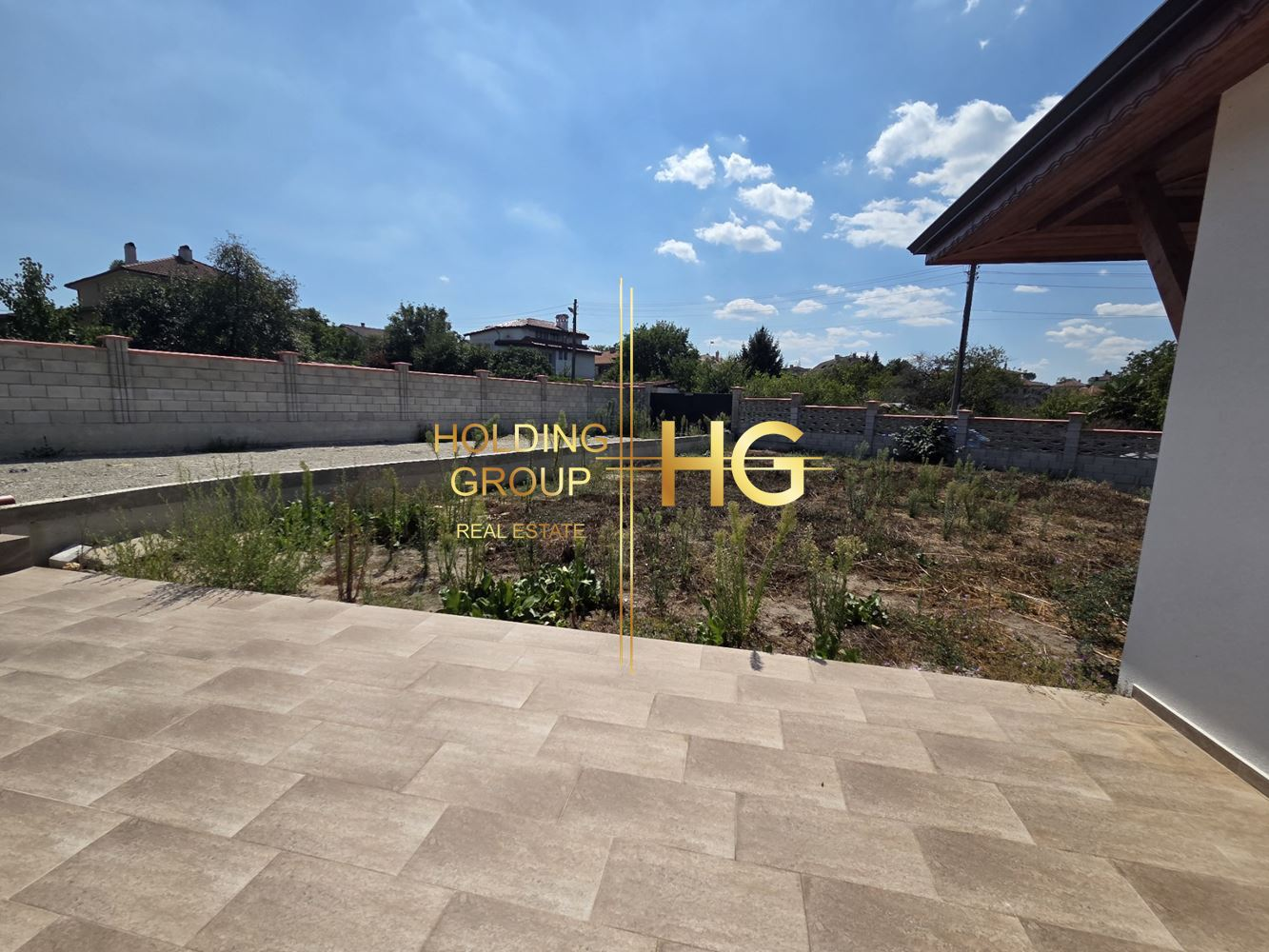 коридор, просторна дневна с площ от 49,35 кв.м., с излаз на голяма веранда /31,56 кв.м/, спалня 14 кв.м., втора спалня с площ от 15,77 кв.м със санитарен възел и дрешник, трета спалня с площ от 16,36 кв.м , килер и още една баня с тоалетна. Ще бъдат изградени гараж и две паркоместа. При желание от страна на новите собственици може да се изгради басейн, сондаж и да бъдат прекарани кабели за фотоволтаици. Къщата се издава завършена до ключ с напълно оборудвани бани. .