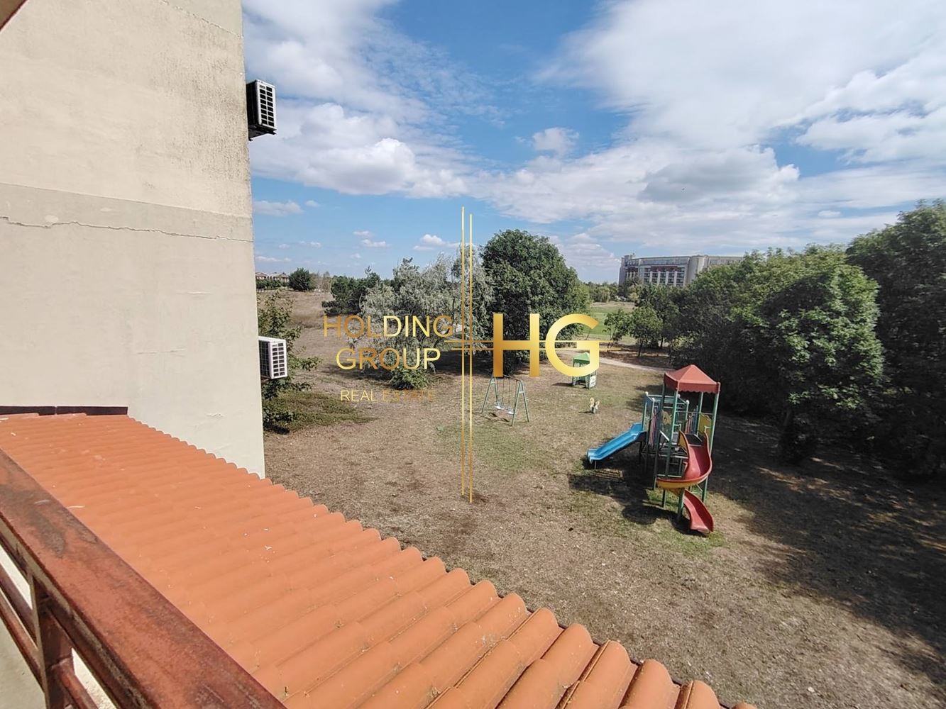 Апартаметна се намира на много спокойно място с изглед към детска площадка и малка борова гора.