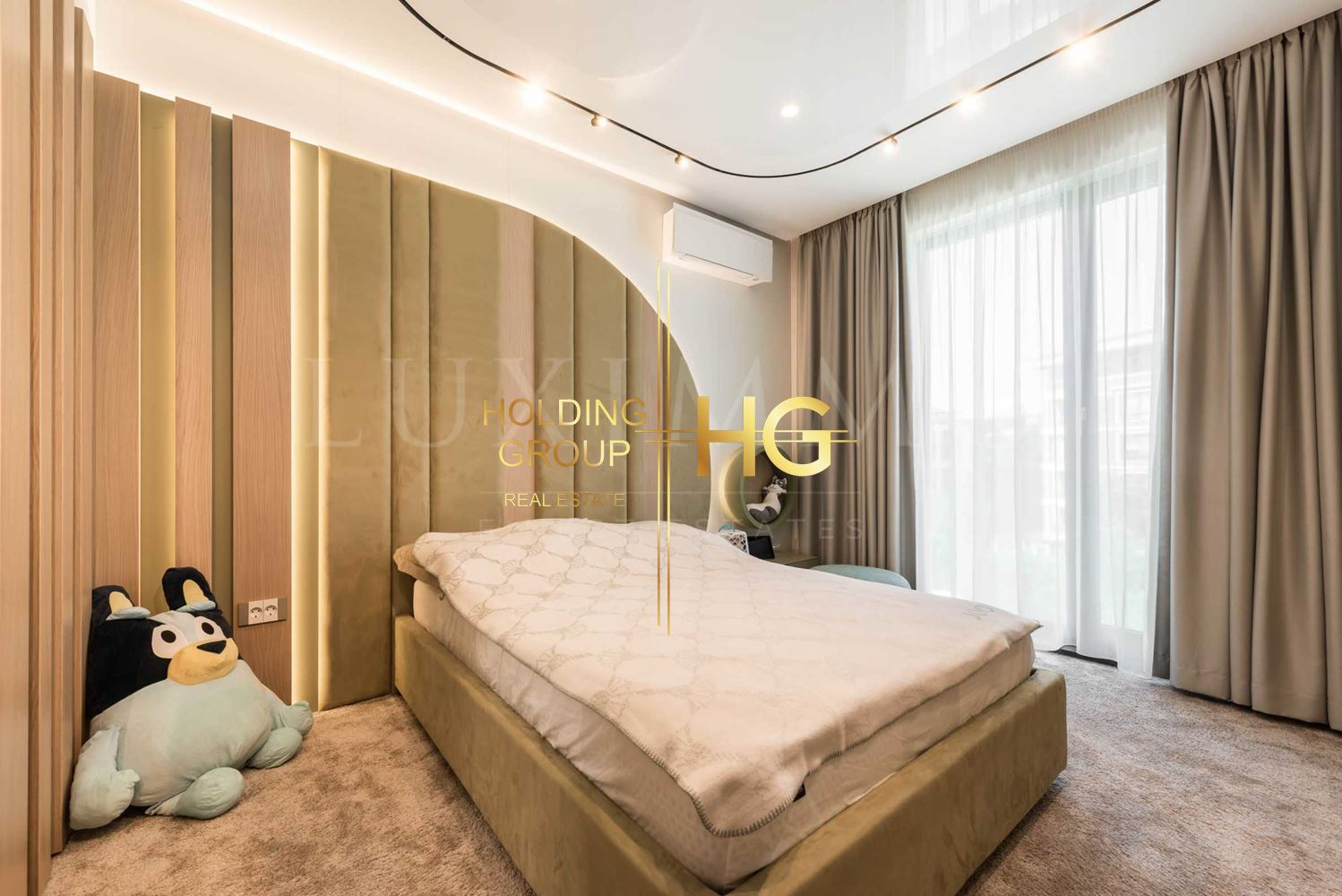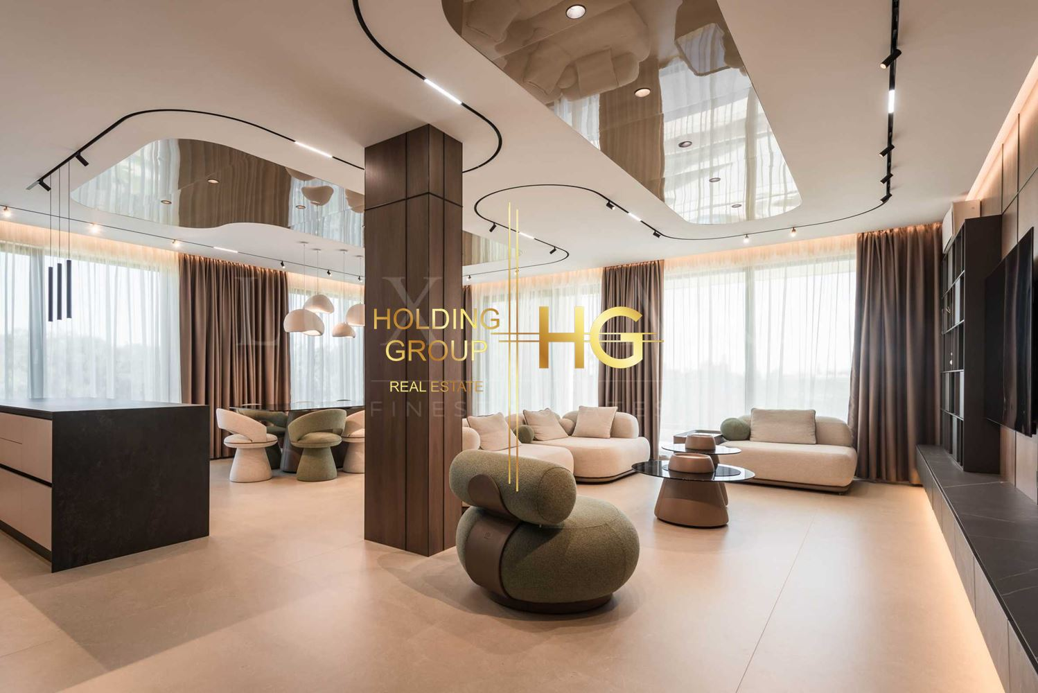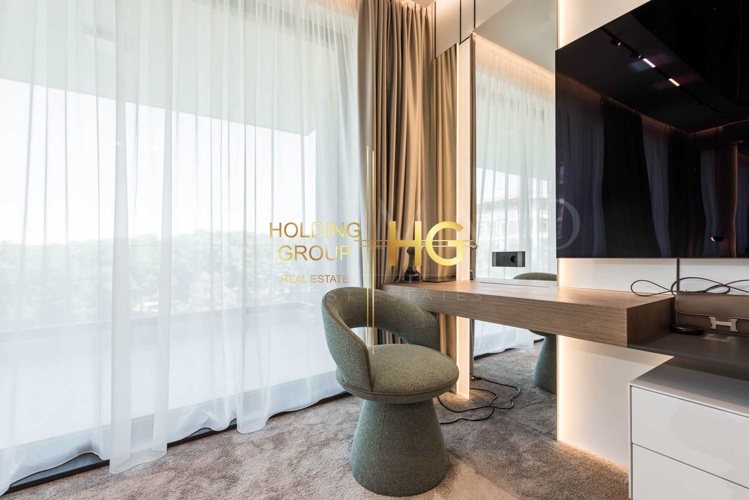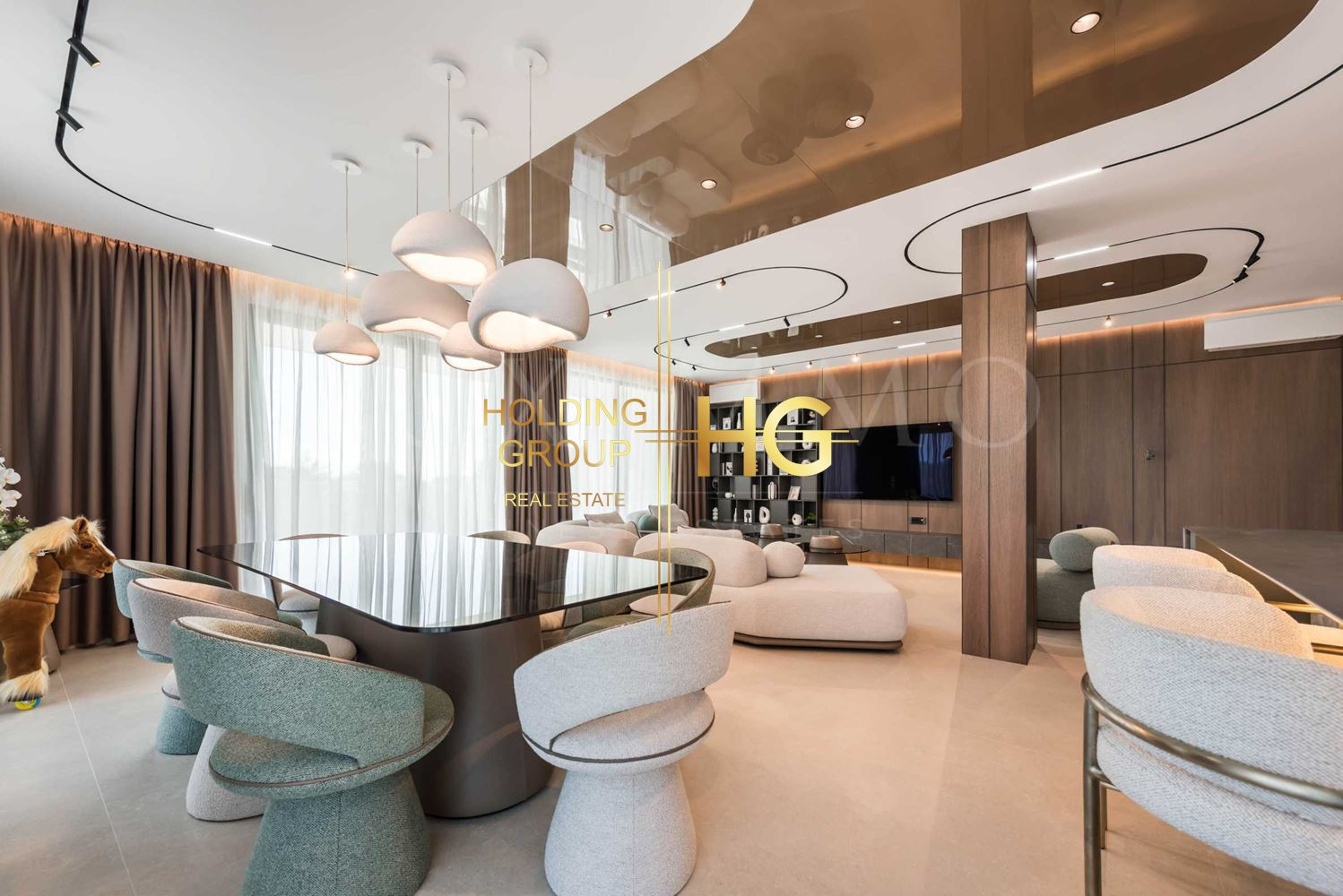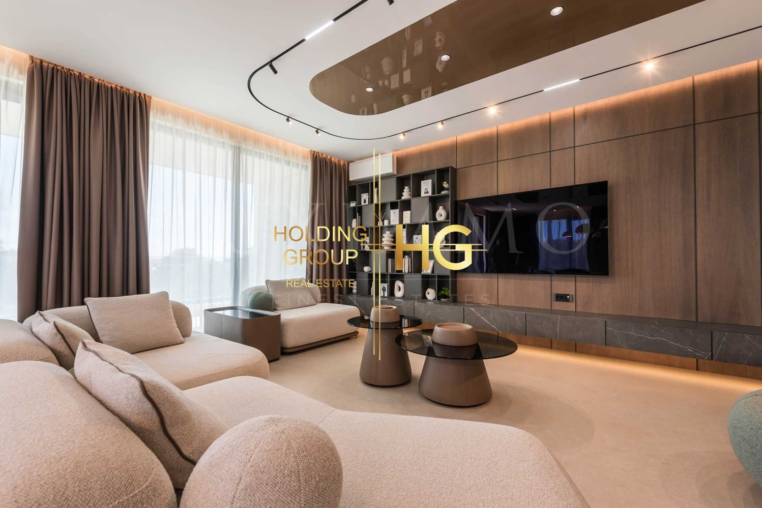 Интериорът на имота излъчва модерна елегантност и изключително внимание към детайла. Апартаментът е луксозно обзаведен по дизайнерски проект с поръчкови италиански мебели и висок клас техника Miele. В дневната зона впечатление правят подбрани мебели с органични форми – удобни дивани и кресла, комбинирани с ниски маси и стилен ТВ модул. Пространството е решено в меки земни тонове, а акцентите са поставени чрез атрактивни модерни тавани със съвременно осветление – вградено, линейно и дизайнерски висящи лампи, които подчертават зоните и придават характер на имота. Спалните следват същата концепция – земни тонове, акцентно осветление и дизайнерски решения, които съчетават комфорт и стил. Атмосферата е премислена така, че да носи лукс и едновременно спокойствие.