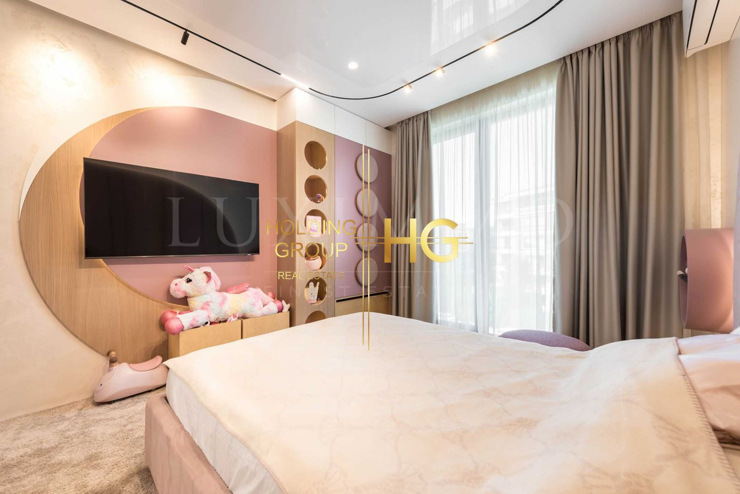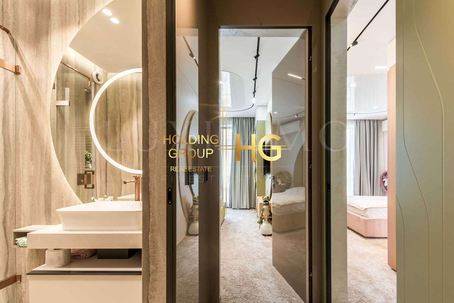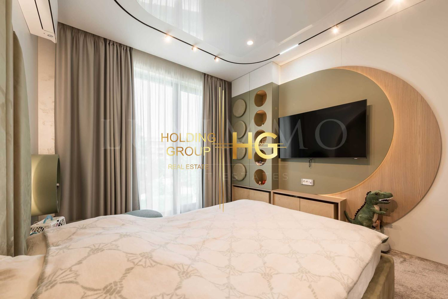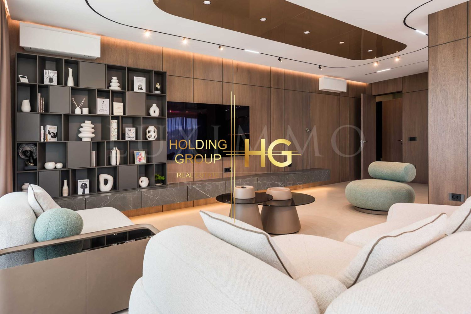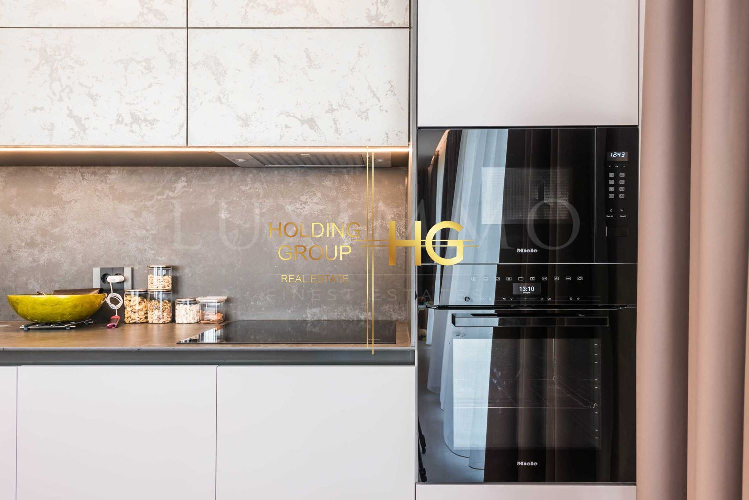 Интериорът на имота излъчва модерна елегантност и изключително внимание към детайла. Апартаментът е луксозно обзаведен по дизайнерски проект с поръчкови италиански мебели и висок клас техника Miele. В дневната зона впечатление правят подбрани мебели с органични форми – удобни дивани и кресла, комбинирани с ниски маси и стилен ТВ модул. Пространството е решено в меки земни тонове, а акцентите са поставени чрез атрактивни модерни тавани със съвременно осветление – вградено, линейно и дизайнерски висящи лампи, които подчертават зоните и придават характер на имота. Спалните следват същата концепция – земни тонове, акцентно осветление и дизайнерски решения, които съчетават комфорт и стил. Атмосферата е премислена така, че да носи лукс и едновременно спокойствие.