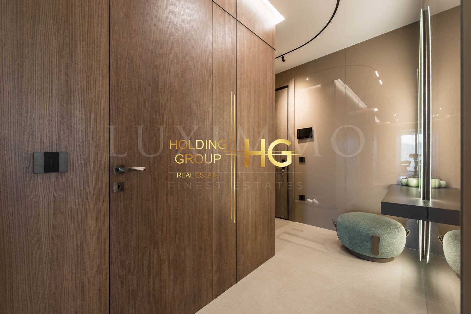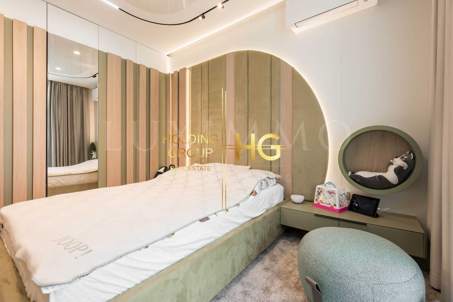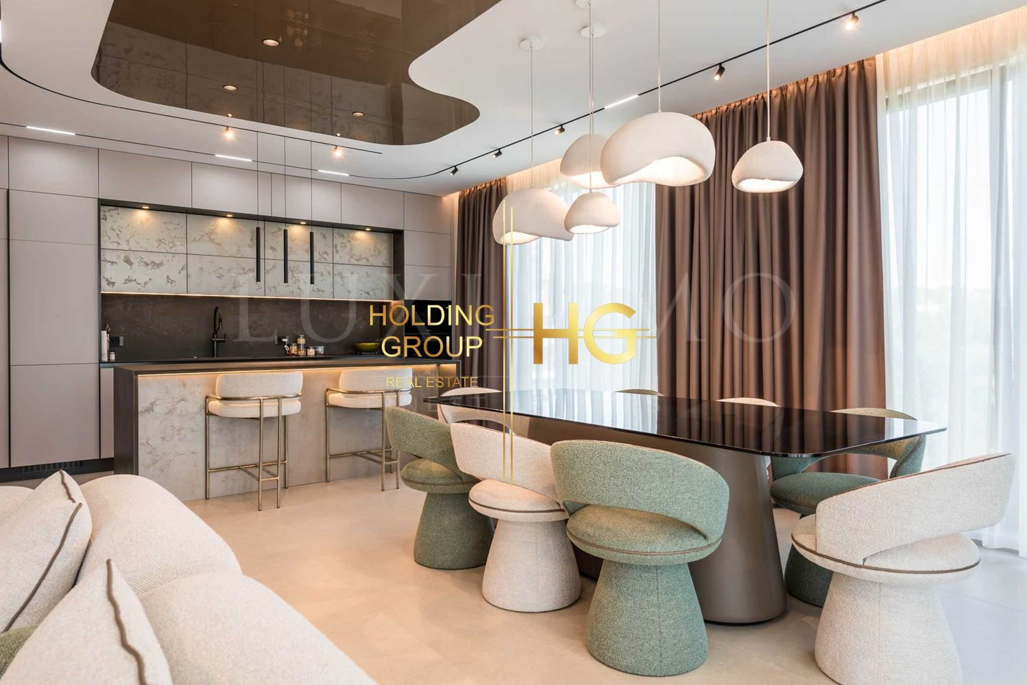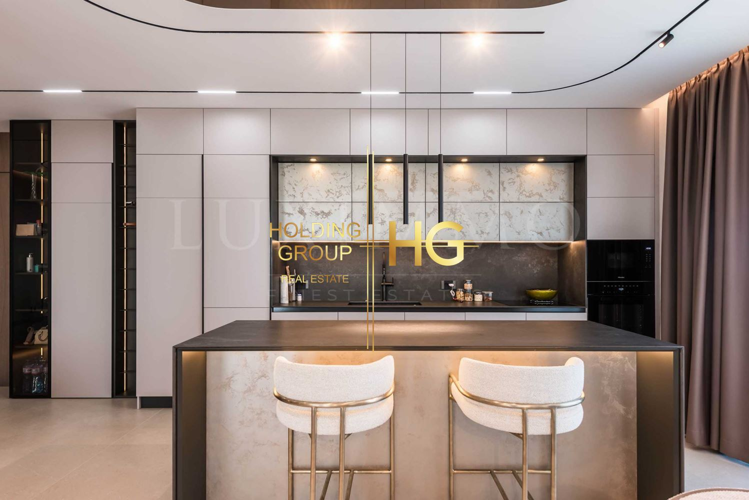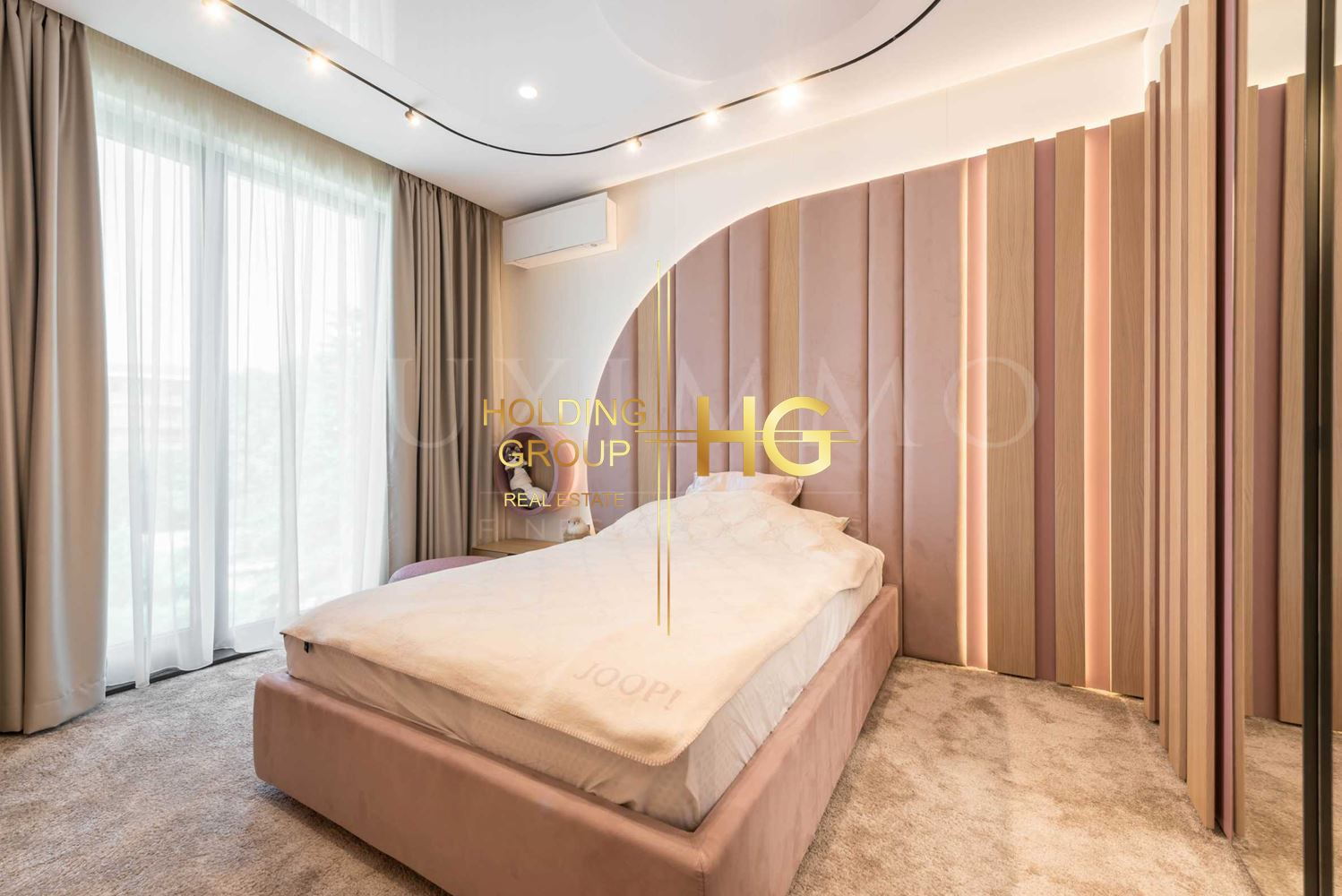 Интериорът на имота излъчва модерна елегантност и изключително внимание към детайла. Апартаментът е луксозно обзаведен по дизайнерски проект с поръчкови италиански мебели и висок клас техника Miele. В дневната зона впечатление правят подбрани мебели с органични форми – удобни дивани и кресла, комбинирани с ниски маси и стилен ТВ модул. Пространството е решено в меки земни тонове, а акцентите са поставени чрез атрактивни модерни тавани със съвременно осветление – вградено, линейно и дизайнерски висящи лампи, които подчертават зоните и придават характер на имота. Спалните следват същата концепция – земни тонове, акцентно осветление и дизайнерски решения, които съчетават комфорт и стил. Атмосферата е премислена така, че да носи лукс и едновременно спокойствие.
