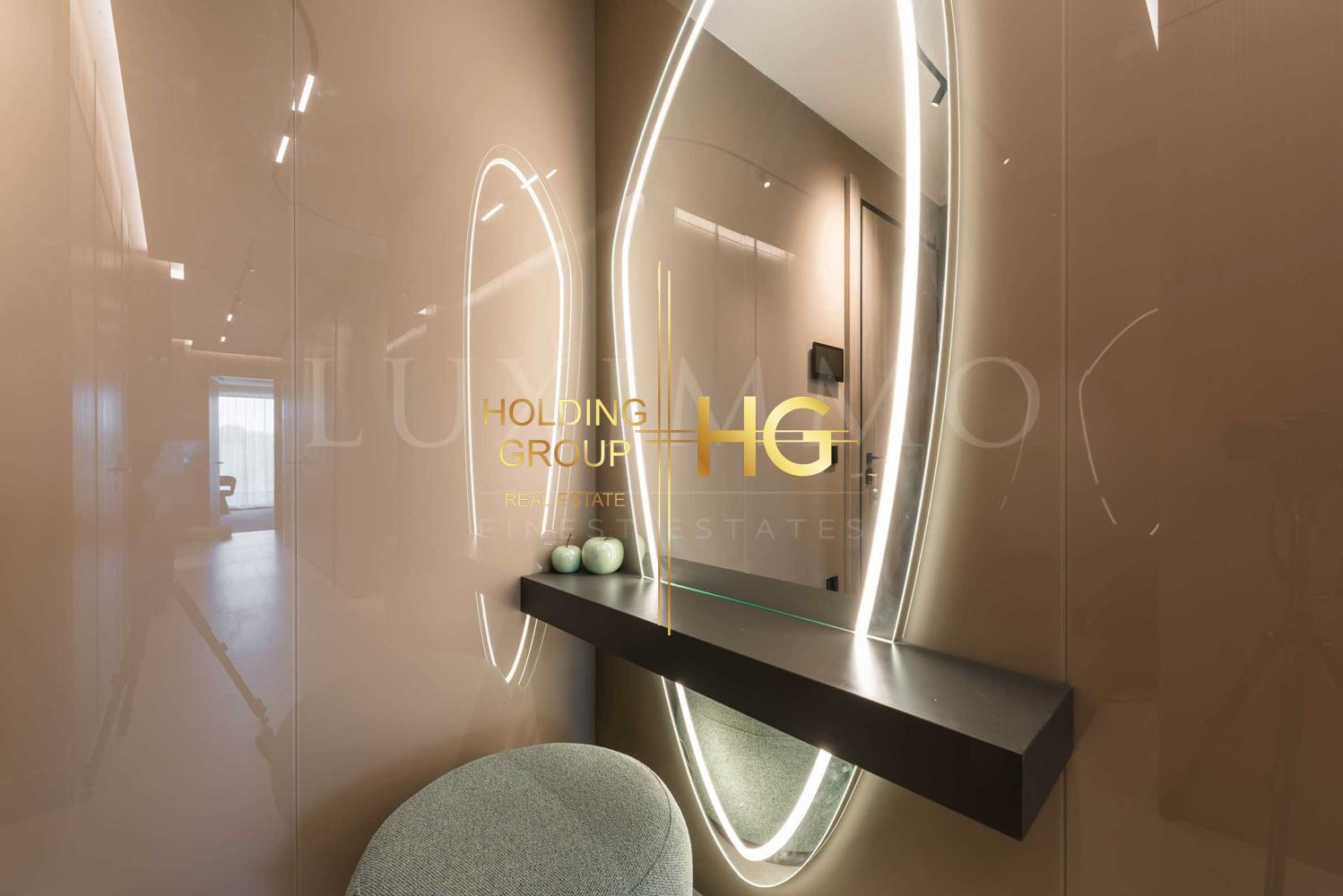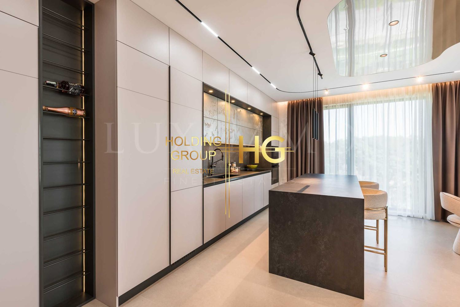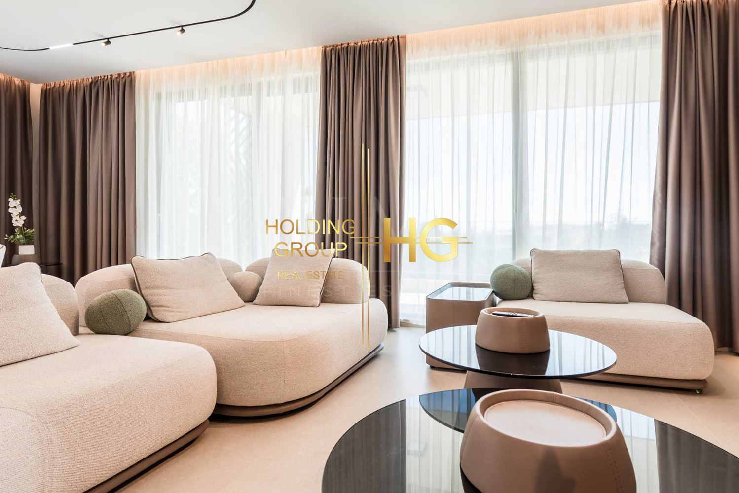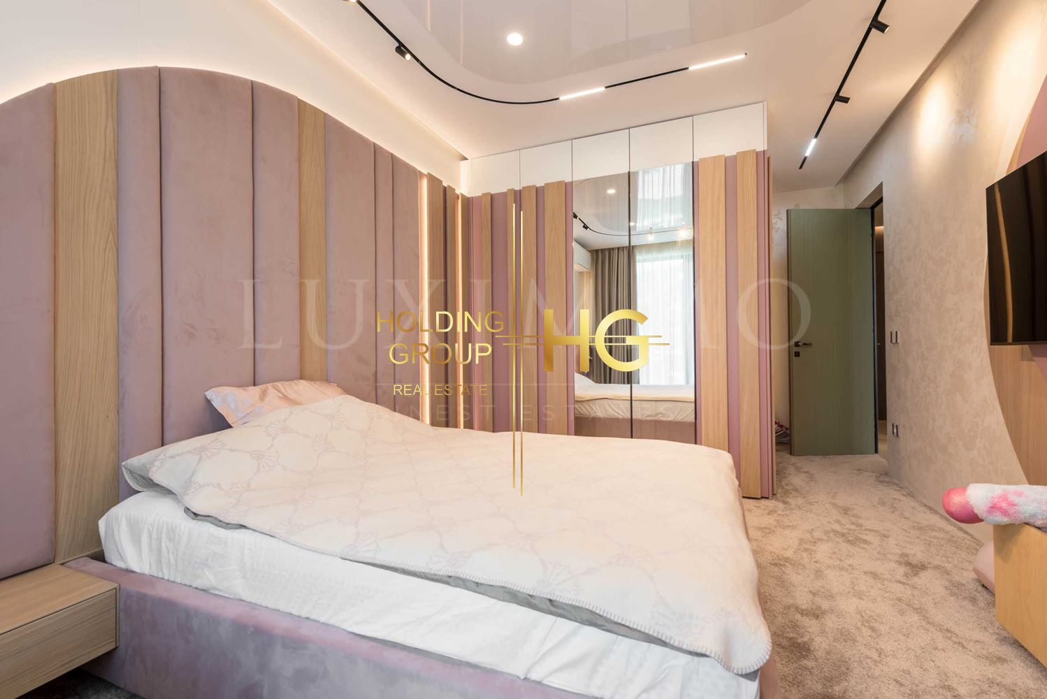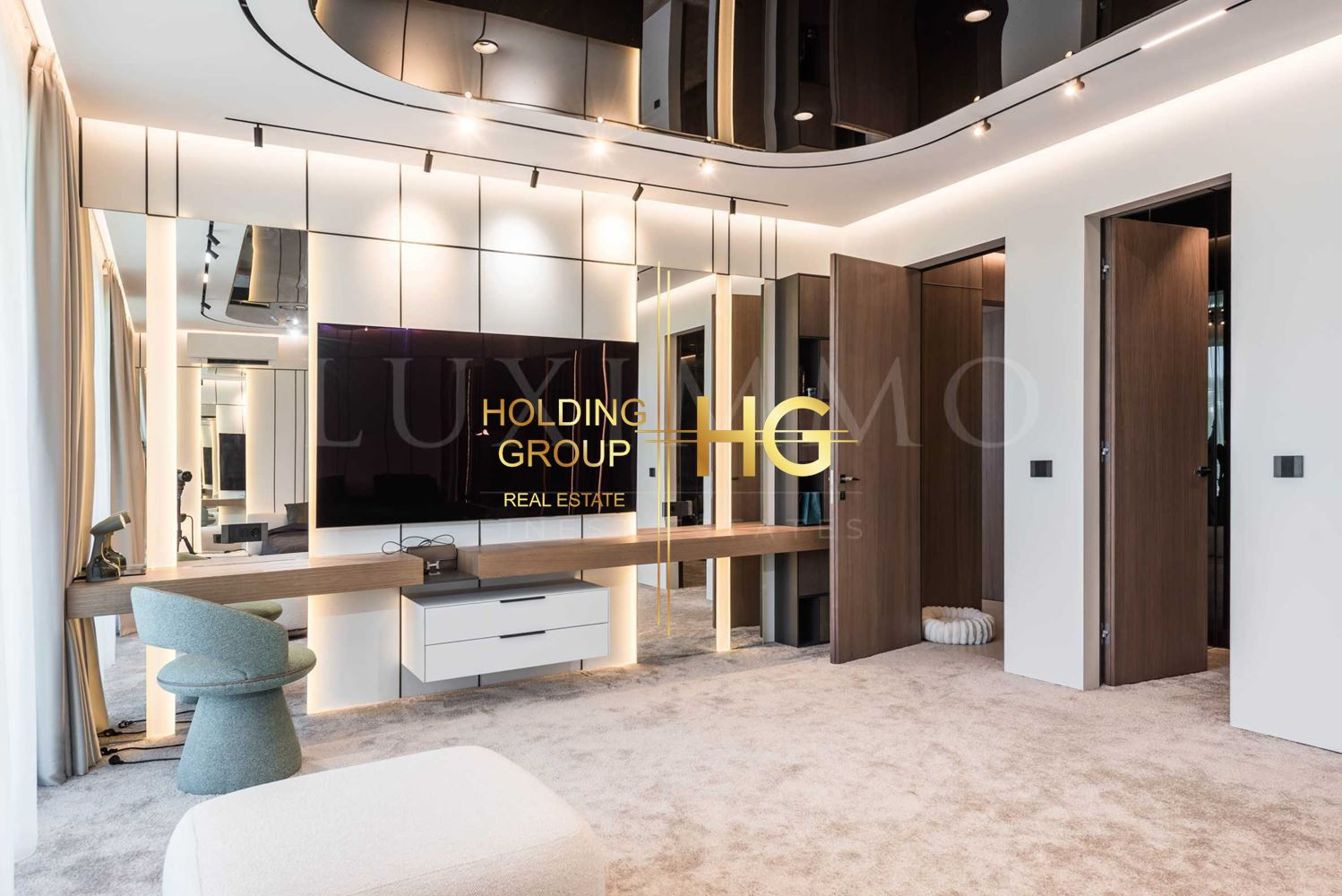Интериорът на имота излъчва модерна елегантност и изключително внимание към детайла. Апартаментът е луксозно обзаведен по дизайнерски проект с поръчкови италиански мебели и висок клас техника Miele. В дневната зона впечатление правят подбрани мебели с органични форми – удобни дивани и кресла, комбинирани с ниски маси и стилен ТВ модул. Пространството е решено в меки земни тонове, а акцентите са поставени чрез атрактивни модерни тавани със съвременно осветление – вградено, линейно и дизайнерски висящи лампи, които подчертават зоните и придават характер на имота. Спалните следват същата концепция – земни тонове, акцентно осветление и дизайнерски решения, които съчетават комфорт и стил. Атмосферата е премислена така, че да носи лукс и едновременно спокойствие.