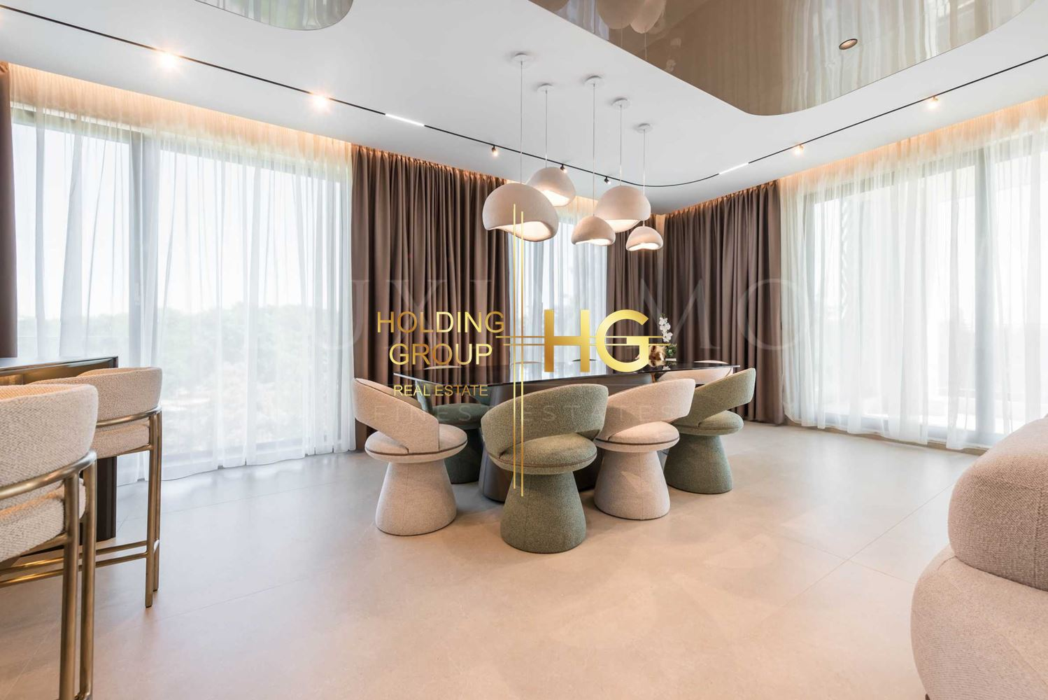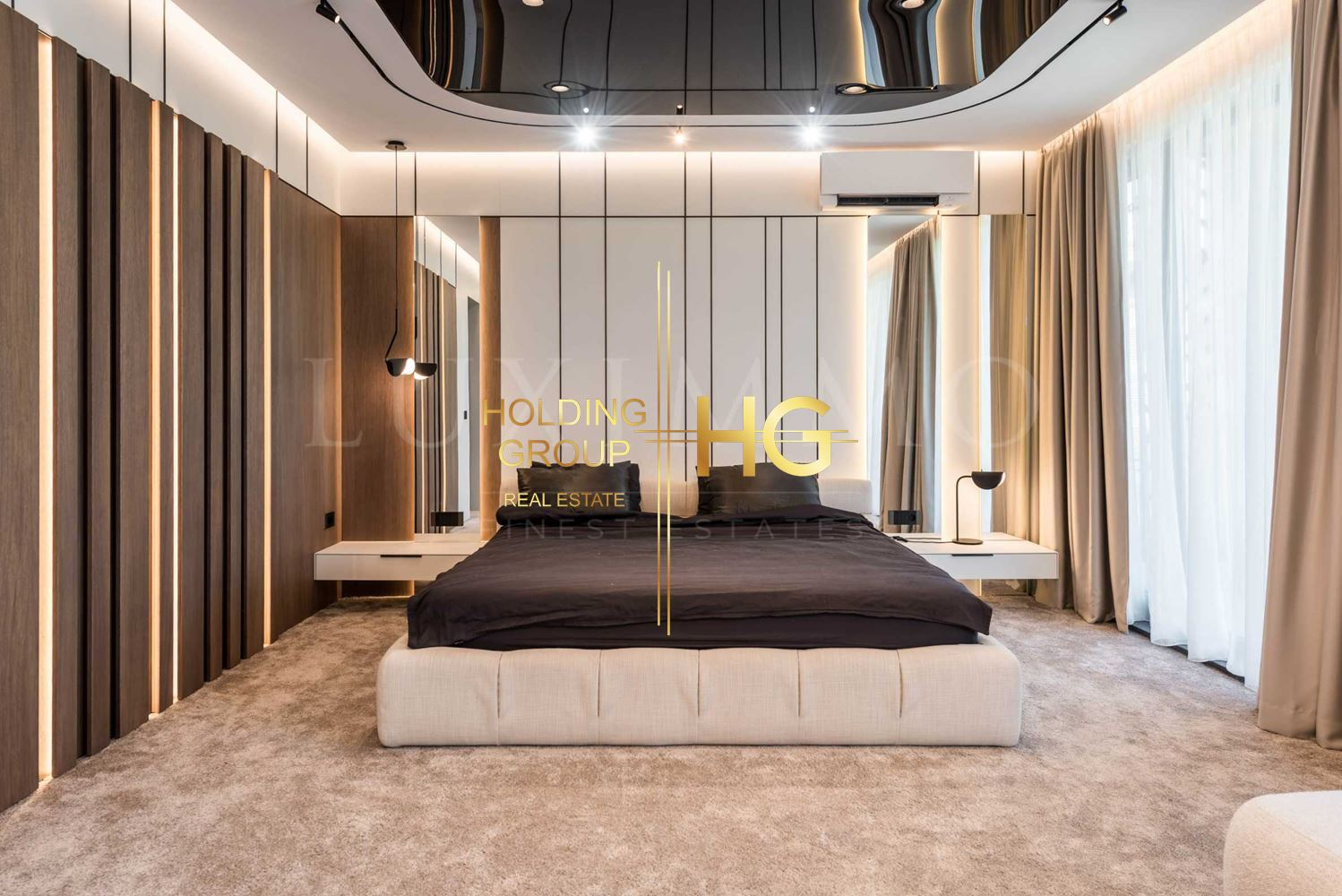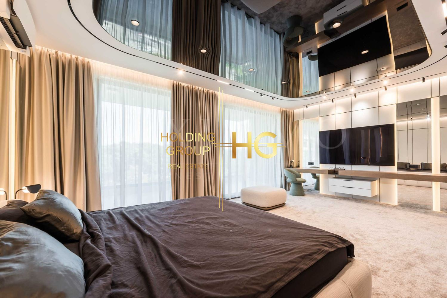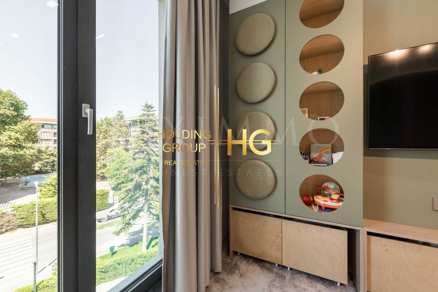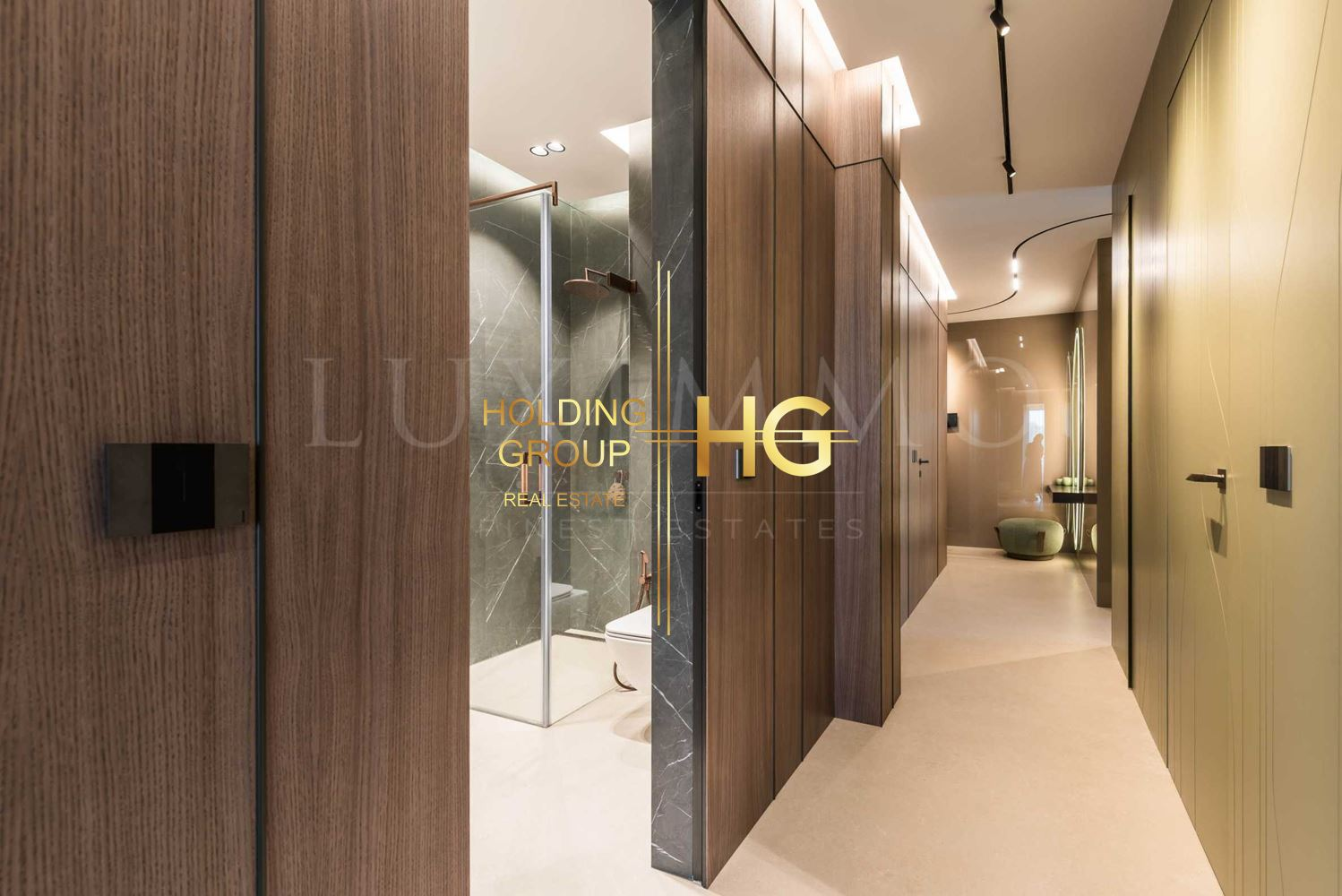 Интериорът на имота излъчва модерна елегантност и изключително внимание към детайла. Апартаментът е луксозно обзаведен по дизайнерски проект с поръчкови италиански мебели и висок клас техника Miele. В дневната зона впечатление правят подбрани мебели с органични форми – удобни дивани и кресла, комбинирани с ниски маси и стилен ТВ модул. Пространството е решено в меки земни тонове, а акцентите са поставени чрез атрактивни модерни тавани със съвременно осветление – вградено, линейно и дизайнерски висящи лампи, които подчертават зоните и придават характер на имота. Спалните следват същата концепция – земни тонове, акцентно осветление и дизайнерски решения, които съчетават комфорт и стил. Атмосферата е премислена така, че да носи лукс и едновременно спокойствие.