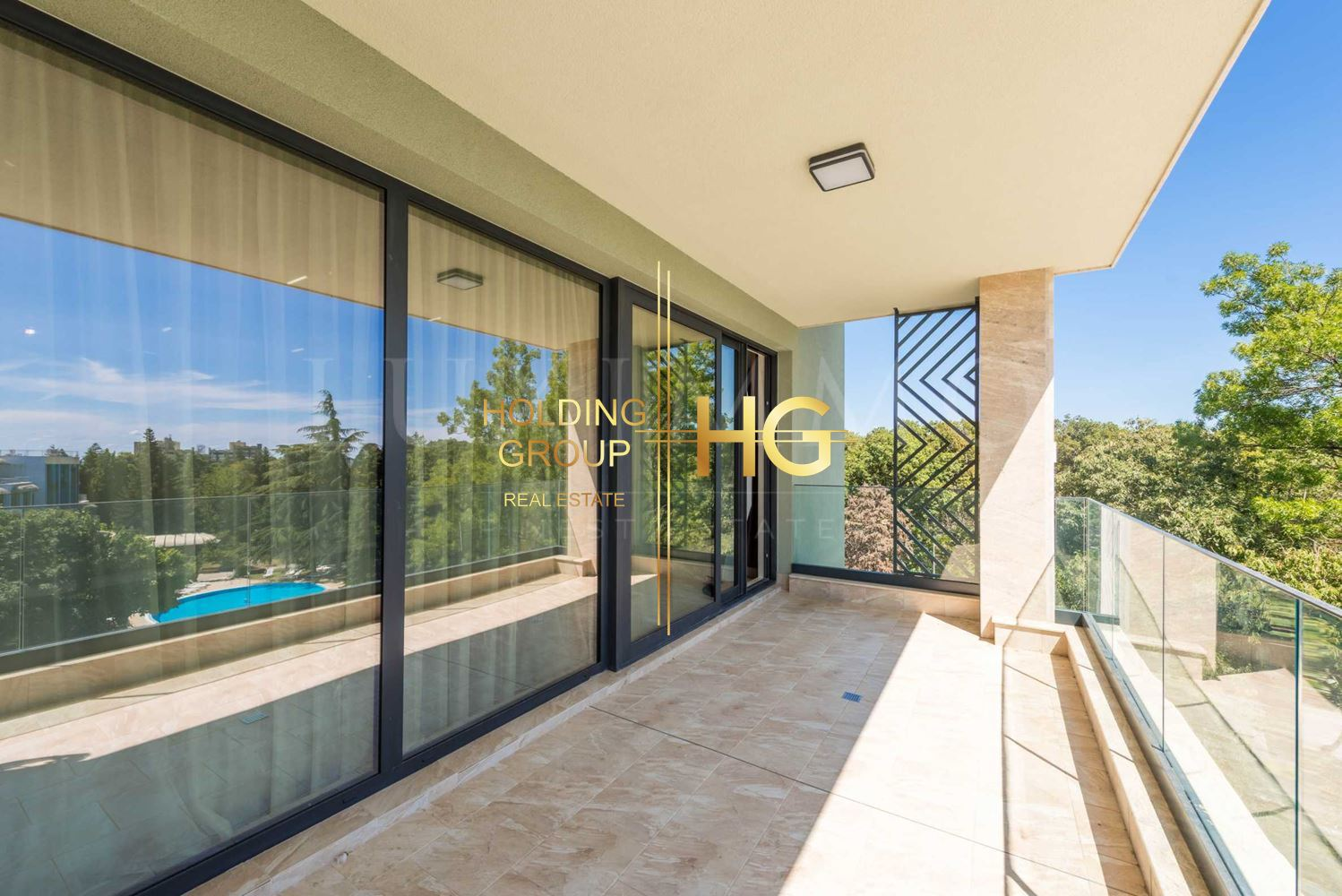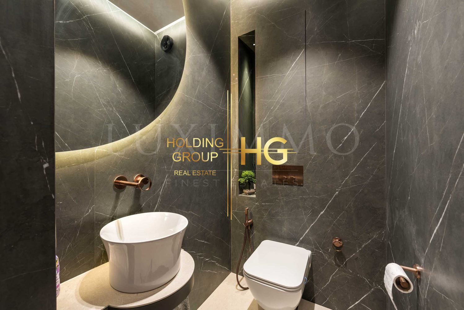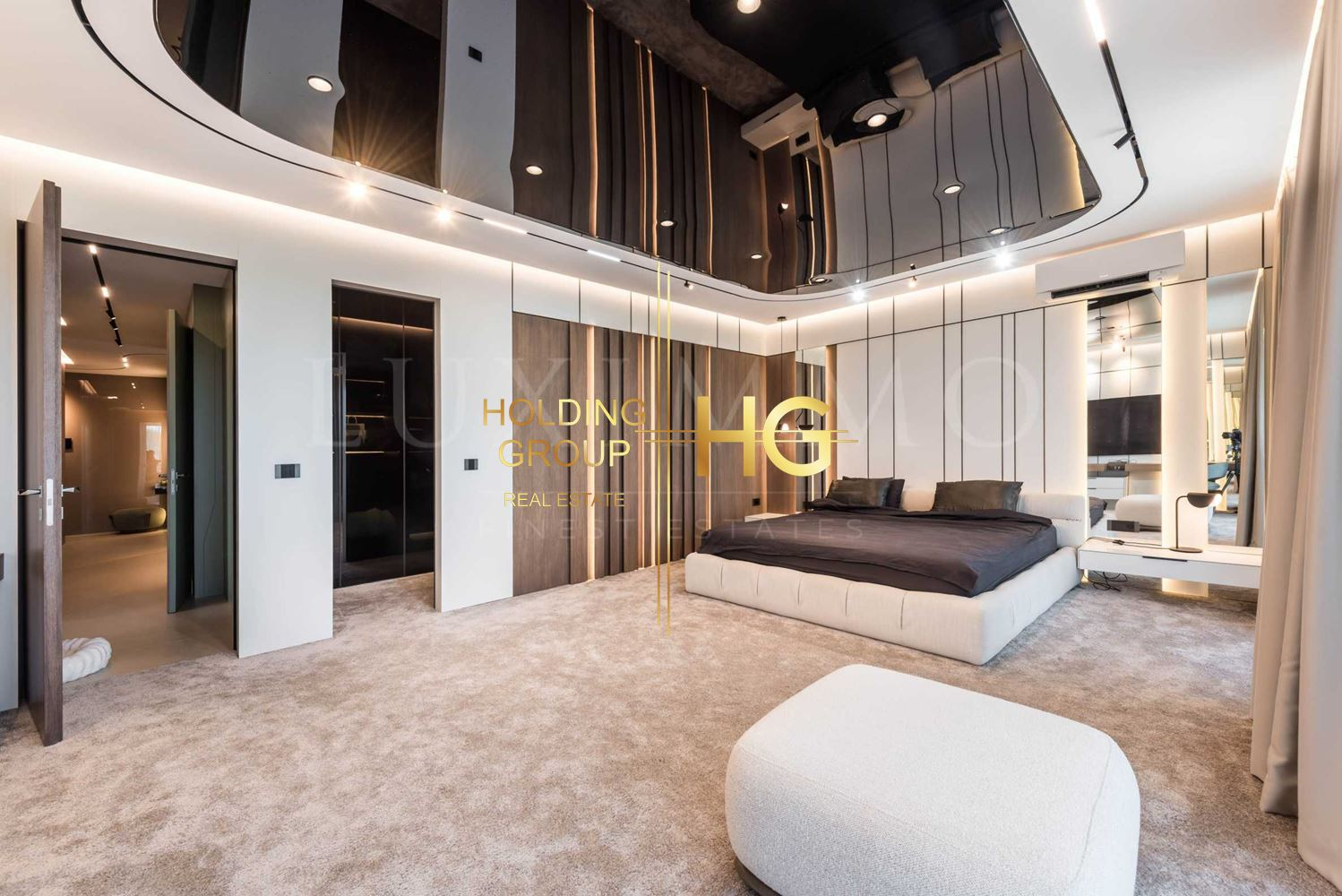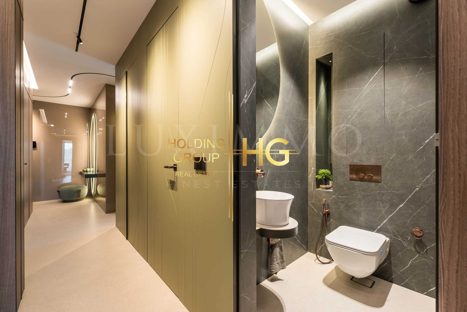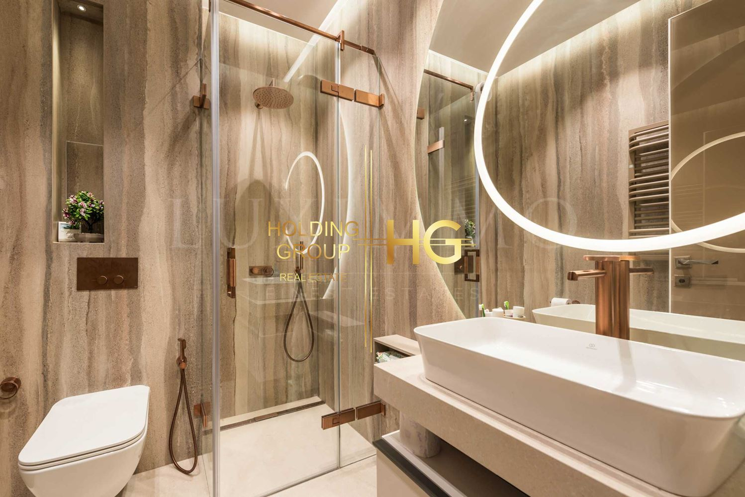 Интериорът на имота излъчва модерна елегантност и изключително внимание към детайла. Апартаментът е луксозно обзаведен по дизайнерски проект с поръчкови италиански мебели и висок клас техника Miele. В дневната зона впечатление правят подбрани мебели с органични форми – удобни дивани и кресла, комбинирани с ниски маси и стилен ТВ модул. Пространството е решено в меки земни тонове, а акцентите са поставени чрез атрактивни модерни тавани със съвременно осветление – вградено, линейно и дизайнерски висящи лампи, които подчертават зоните и придават характер на имота. Спалните следват същата концепция – земни тонове, акцентно осветление и дизайнерски решения, които съчетават комфорт и стил. Атмосферата е премислена така, че да носи лукс и едновременно спокойствие.