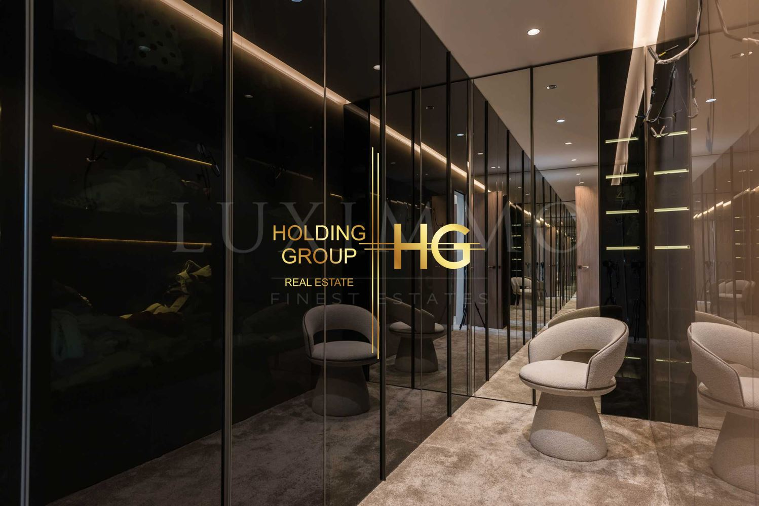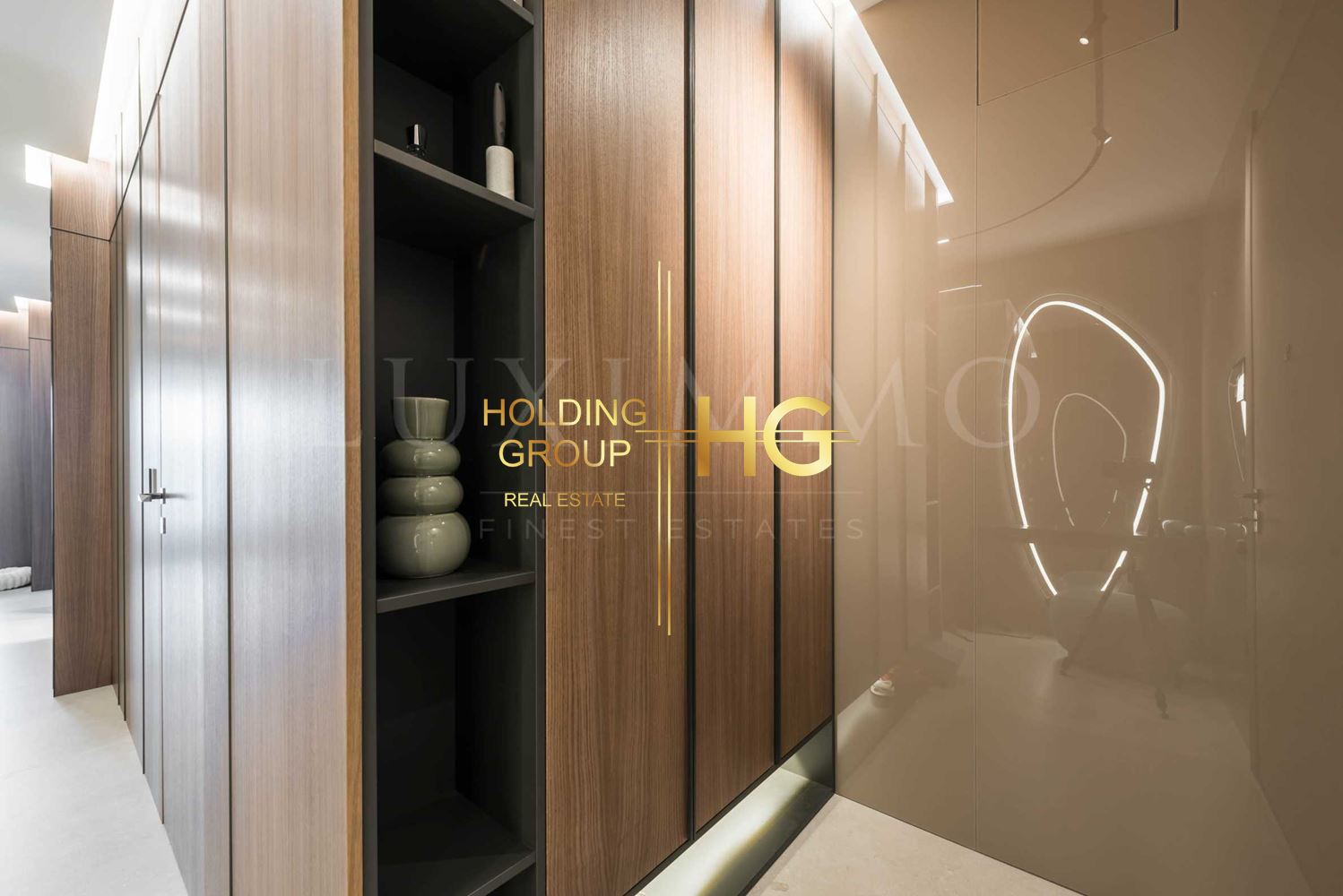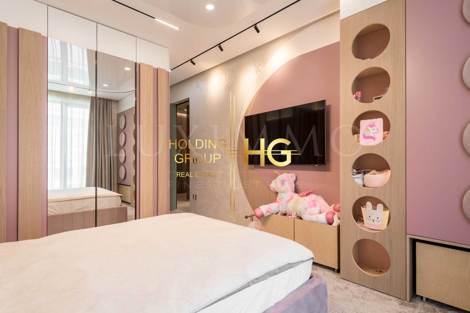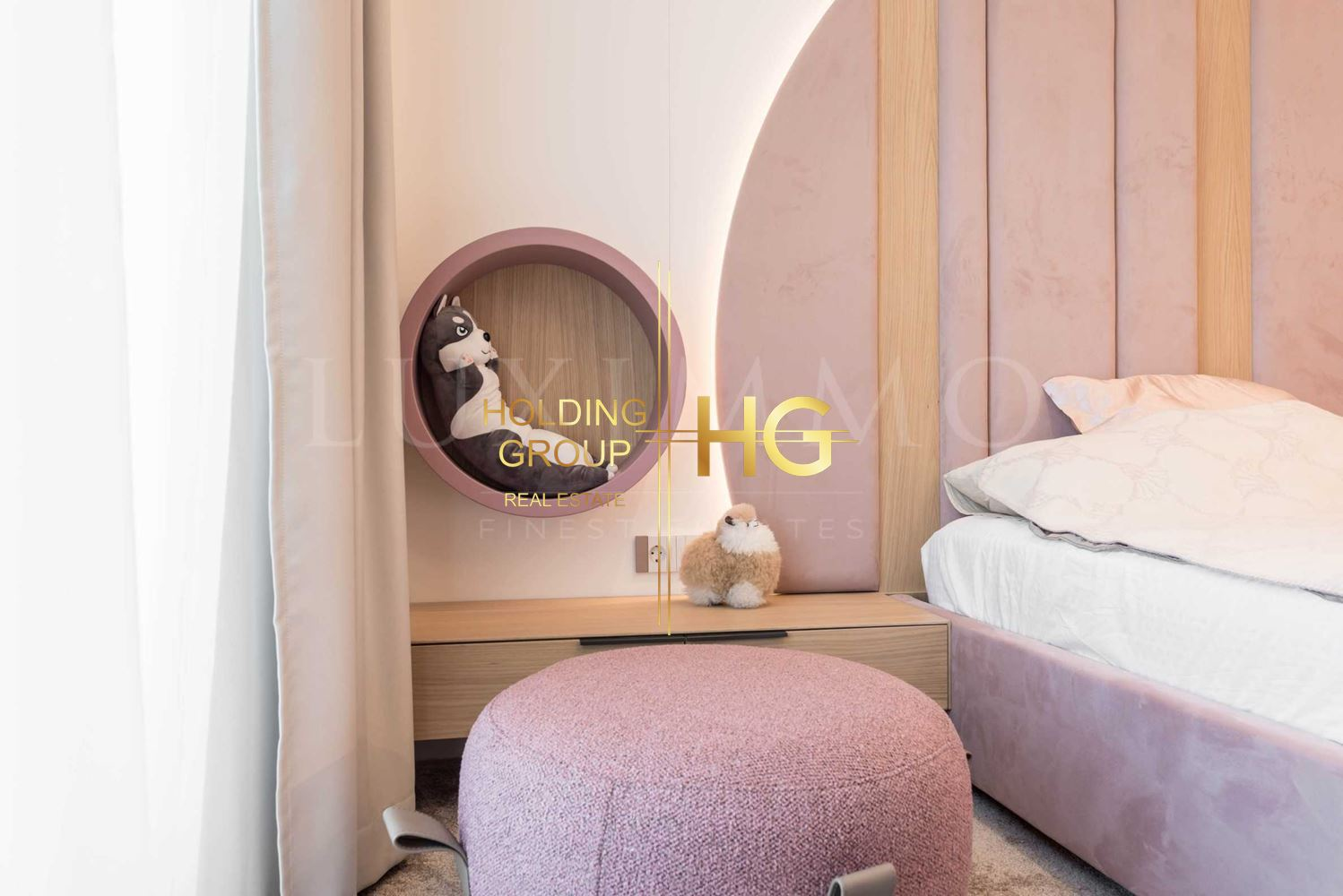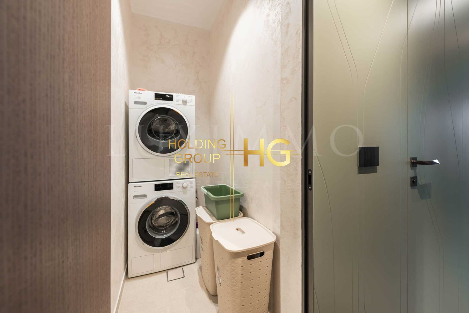 Интериорът на имота излъчва модерна елегантност и изключително внимание към детайла. Апартаментът е луксозно обзаведен по дизайнерски проект с поръчкови италиански мебели и висок клас техника Miele. В дневната зона впечатление правят подбрани мебели с органични форми – удобни дивани и кресла, комбинирани с ниски маси и стилен ТВ модул. Пространството е решено в меки земни тонове, а акцентите са поставени чрез атрактивни модерни тавани със съвременно осветление – вградено, линейно и дизайнерски висящи лампи, които подчертават зоните и придават характер на имота. Спалните следват същата концепция – земни тонове, акцентно осветление и дизайнерски решения, които съчетават комфорт и стил. Атмосферата е премислена така, че да носи лукс и едновременно спокойствие.