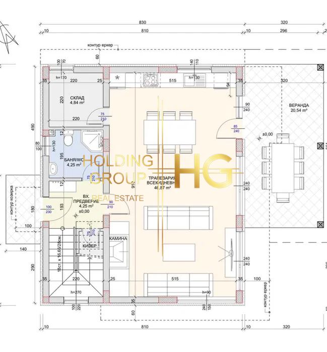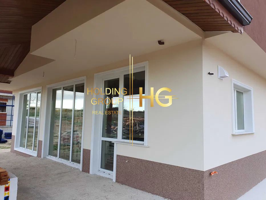 1 – ви етаж: входно антре, коридор, баня с тоалетна, складово помещение, вътрешно стълбище към втория етаж, просторна дневна 46,7м2 с френски прозорци и веранда от 20,54 м2 покрита с покрив.