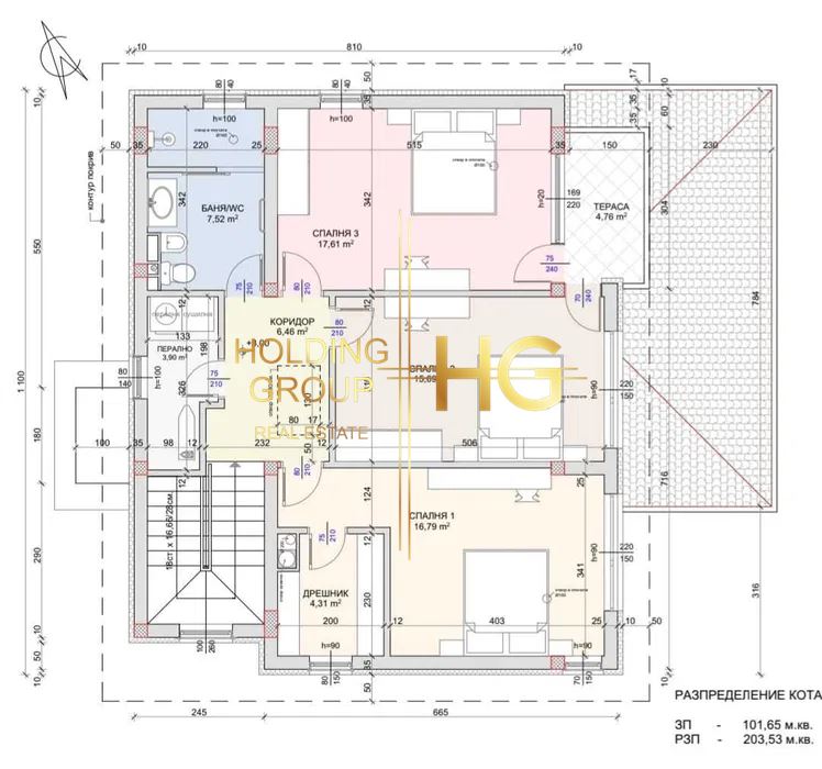 2 – ри етаж: 3 спални (17.61 м2; 15.69 м2; 16.79 м2), санитарен възел баня и тоалетна (7.52 м2), перално помещение, гардеробна, две от спалните са с излаз на тераса.