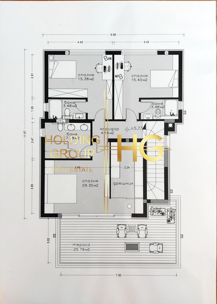Втори етаж – 137,52 кв.м.: 3 спални – родителска спалня със собствени комбиниран санитарен възел, дрешник и тераса /25,79 кв.м./, и две спални /по 15,40 кв.м./ със собствени санитарни възели.