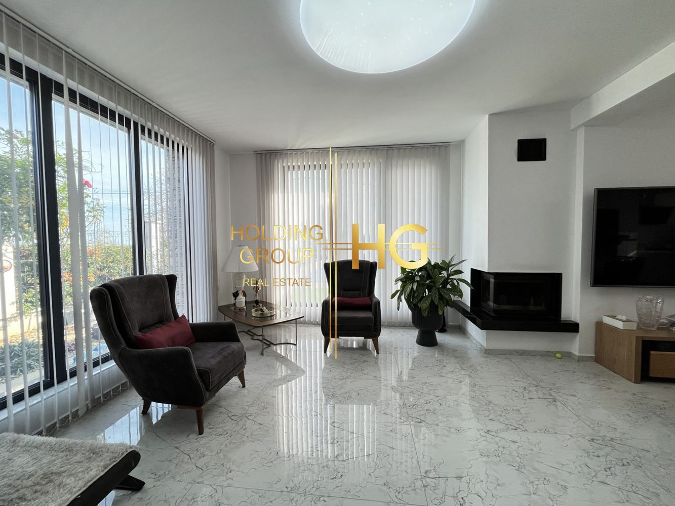 1-ви етаж: голямо входно антре с отделна гардеробна и тоалетна, просторен хол с камина и трапезария и кухня /50 кв.м./, спалня за гости със собствен комбиниран санитарен възел, вътрешни стълби, веранда към градина и басейна;